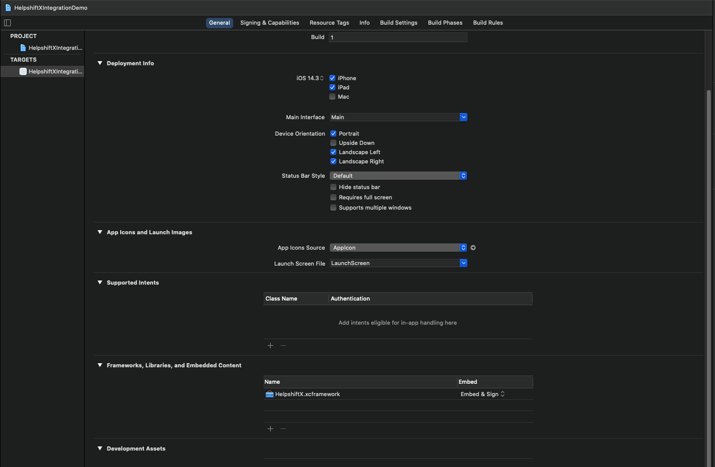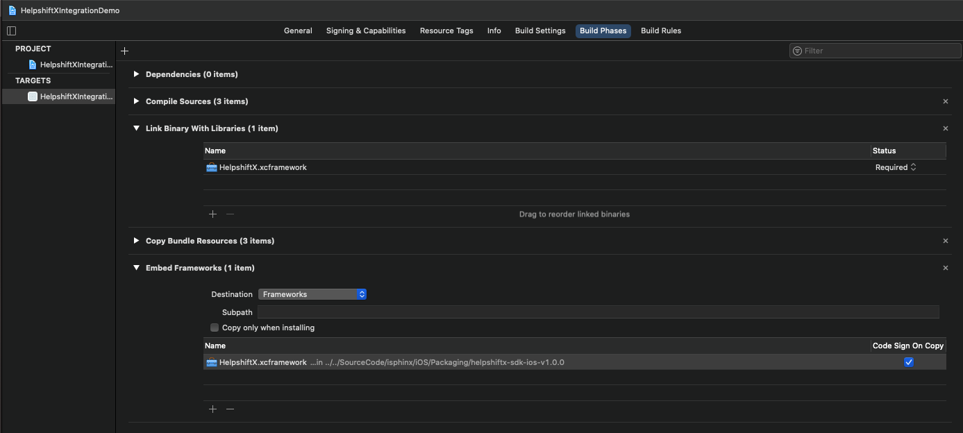 • In the General section of your app target, verify that the HelpshiftX.xcframework is present in the Framework, Libraries, and Embedded Content section with the option Embed and Sign selected from the Embed options dropdown.